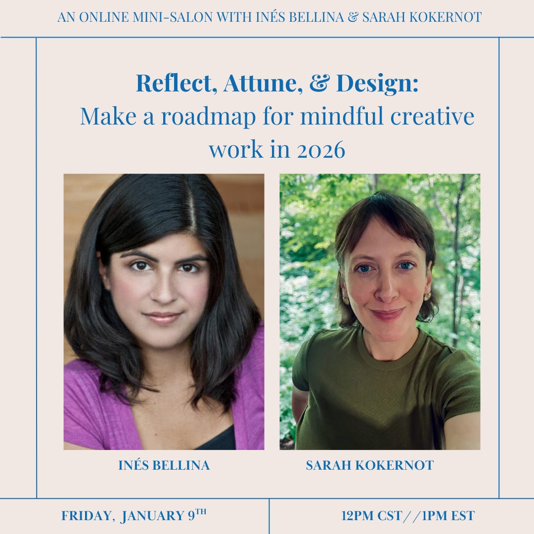 Each mini-salon offers a different topic and paid subscribers are invited to send us their questions beforehand. January’s’s mini-salon topic is “Reflect, Attune & Design: Make a roadmap for mindful creative work in 2026.” While previous mini-salons were mostly group-based discussions, this one will be a mix of venting, tapping into our intuition, and guided journaling. We want you to leave with an actionable plan for your creative projects, but one that won’t feel like a burden on your already packed to-do list.